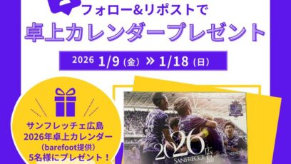 SNS応募の懸賞【X懸賞】サンフレッチェ広島 卓上カレンダーを5名様にプレゼント 締切:2026-01-18 広島県立総合体育館(広島グリーンアリーナ)‐フォロー&リポストキャンペーン 賞品:サンフレッチェ広島 卓上カレンダー(5名様) 締切:2026年1月18日(日) 公式...SNS応募の懸賞