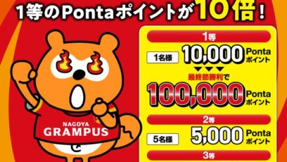 SNS応募の懸賞【X懸賞】選手直筆サイン入りグランパスポンタ応援メッセージタオル、Pontaポイント最大100,000ポイントを合計761名様にプレゼント