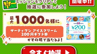 ネット応募の懸賞【毎日・アプリ】サーティワンアイスクリーム 200円ギフト券が1,000名様にその場で当たる! 締切:2025-11-10 スヌーピードロップス‐デジタルギフトキャンペーン 賞品:サーティワンアイスクリーム 200円ギフト券(最大1,000名様) 締切:2025年11月10日(月) ミッシ...ネット応募の懸賞大量当選(1000名~)の懸賞ギフト券・商品券が当たる懸賞毎日応募できる懸賞