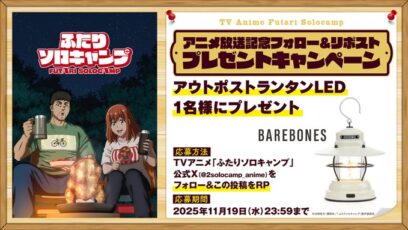 SNS応募の懸賞【X懸賞】BAREBONESのアウトポストランタンLEDを1名様にプレゼント 締切:2025-11-19 TVアニメ「ふたりソロキャンプ」‐フォロー&リポストキャンペーン 賞品:BAREBONESのアウトポストランタンLED(1名様) 締切:2025年11月19日(水) ...SNS応募の懸賞