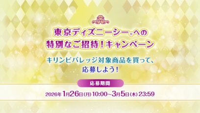ネット応募の懸賞東京ディズニーシー®25周年“スパークリング・ジュビリー”スペシャルナイトご招待&ホテルご宿泊などを合計345名様にプレゼント 締切:2026-03-05 キリン‐東京ディズニーシー®への特別なご招待!キャンペーン 賞品: 東京ディズニーシー®25周年“スパークリング・ジュビリー”スペシャルナイトご招待(ペア)&東京ディズニーシ...ネット応募の懸賞大量当選(100名~)の懸賞
