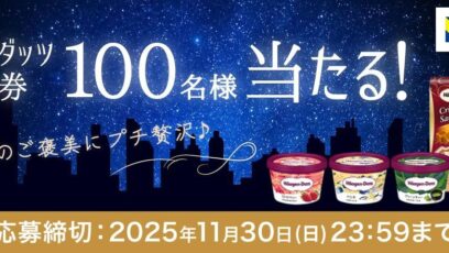 ネット応募の懸賞ハーゲンダッツギフト券を100名様にプレゼント 締切:2025-11-30 Vサンプル‐ハーゲンダッツ ギフト券プレゼントキャンペーン 賞品:ハーゲンダッツ ギフト券(100名様) 締切:2025年11月30日(日) ご応募には会員登録/ログ...ネット応募の懸賞大量当選(100名~)の懸賞ギフト券・商品券が当たる懸賞