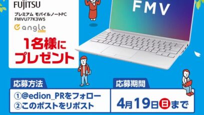 SNS応募の懸賞【Instagram懸賞】ノートパソコン e angle FMV Note Uを1名様にプレゼント 締切:2026-04-19 エディオン‐プレゼントキャンペーン 賞品:e angle FMV Note U(1名様) 締切:2026年4月19日(日) エディオン公式(@official_edi...SNS応募の懸賞豪華賞品が当たる懸賞