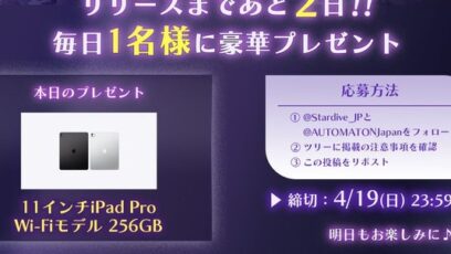 SNS応募の懸賞【X懸賞】iPad Pro Wi‑Fiモデル 256GB 11インチを1名様にプレゼント 締切:2026-04-19 AUTOMATON‐Wフォロー&リポストキャンペーン 賞品:11インチiPad Pro Wi‑Fiモデル 256GB(1名様) 締切:2026年4月19日(日) @S...SNS応募の懸賞豪華賞品が当たる懸賞