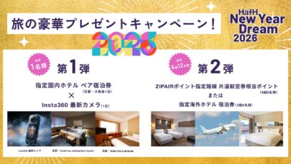 SNS応募の懸賞【X・Instagram懸賞】京都1泊分・大阪1泊分のペア宿泊券+Insta360の最新カメラを1名様にプレゼント 締切:2026-01-18 HafH‐国内ホテル×最新カメラで、旅のスタイルをアップデート。豪華賞品セットが当たる! 賞品:京都1泊分・大阪1泊分の合計2泊分のペア宿泊券+Insta360の最新カメラ1台...SNS応募の懸賞