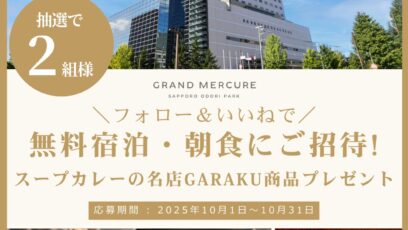 SNS応募の懸賞【Instagram懸賞】グランドメルキュール札幌大通公園 宿泊券、マグカップ、札幌スープカレーチキンを2名様にプレゼント 締切:2025-10-31 グランドメルキュール札幌大通公園‐スープカレーの名店 GARAKU × グランドメルキュール札幌大通公園 コラボプレゼントキャンペーン 賞品: 【無料宿泊ご招待券×1枚】+【...SNS応募の懸賞
