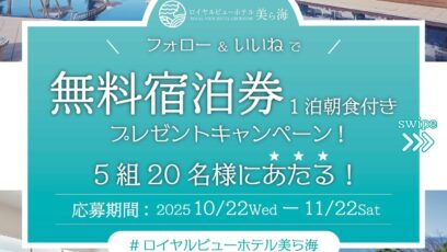 ロイヤルビューホテル美ら海 宿泊キャンペーン 賞品:ロイヤルビューホテル美ら海 宿泊券(5組20名様) 締切:2025年11月22日(土) 応募方法: 1. 公式I...