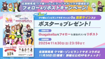 SNS応募の懸賞【X懸賞】キャスト5名の直筆サイン入りポスターを3名様にプレゼント 締切:2025-11-30 さがけいば(佐賀競馬場)‐#佐賀競馬場 #ウマ娘 × #ゾンビランドサガ コラボ開催記念 賞品:キャスト5名の直筆サイン入りポスター(3名様) 締切:2025年11月30日...SNS応募の懸賞