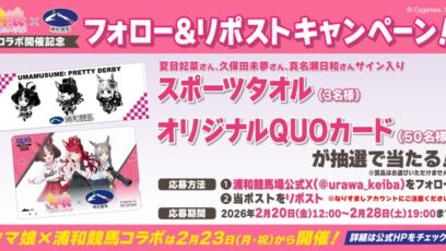 SNS応募の懸賞【X懸賞】ウマ娘キャストのサイン入りグッズ、限定QUOカードを合計53名様にプレゼント 締切:2026-02-28 浦和競馬‐フォロー&リポストキャンペーン 賞品: ウマ娘キャストのサイン入りグッズ(3名様) 限定QUOカード(50名様) 締切:2026年2月28日(土)19:00 ...SNS応募の懸賞ギフト券・商品券が当たる懸賞