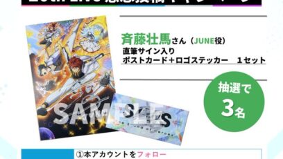 SNS応募の懸賞【X懸賞】JUNE役 斉藤壮馬 サイン入りポストカード&ロゴステッカーを3名様にプレゼント 締切:2026-02-28 TVアニメ『SI-VIS: The Sound of Heroes』‐感想投稿キャンペーン 賞品:JUNE役 斉藤壮馬 サイン入りポストカード&ロゴステッカー(3名様) 締...SNS応募の懸賞