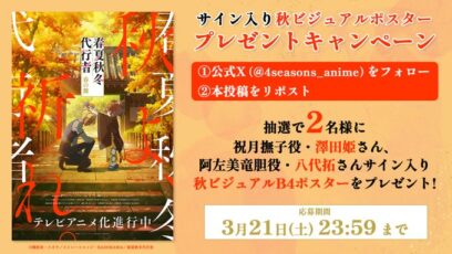 SNS応募の懸賞【X懸賞】サイン入りB4ポスターを2名様にプレゼント 締切:2026-03-21 TVアニメ「春夏秋冬代行者 春の舞」‐フォロー&リポストキャンペーン 賞品:サイン入りB4ポスター(2名様) 締切:2026年3月21日(土) 公式X(Twitter...SNS応募の懸賞