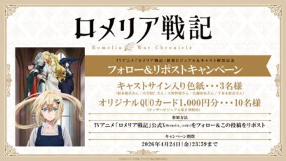 SNS応募の懸賞【X懸賞】サイン入り色紙、オリジナルQUOカード1,000円分を合計13名様にプレゼント 締切:2026-04-24 TVアニメ「ロメリア戦記」新規ビジュアル&キャスト解禁記念 賞品: #根本優奈 さん、#小笠原仁 さん、#大野智敬 さん、#広瀬裕也 さん、#千本木彩花 さんサイン入り色紙…...SNS応募の懸賞ギフト券・商品券が当たる懸賞