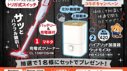 SNS応募の懸賞【X懸賞】マキタ 充電式クリーナー&ハイブリッド加湿器 ウッドモイストを1名様にプレゼント 締切:2025-12-10 ホームセンターコーナン‐#グループ会社コラボ キャンペーン12月 賞品:マキタ 充電式クリーナー&ハイブリッド加湿器 ウッドモイスト(1名様) 締切:2025年12月10日...SNS応募の懸賞