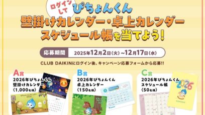 ネット応募の懸賞ぴちょんくんカレンダー・スケジュール帳を合計1,200名様にプレゼント 締切:2025-12-17 ダイキン工業株式会社‐2026年ぴちょんくんカレンダープレゼントキャンペーン 賞品:ぴちょんくんカレンダー・スケジュール帳(合計1,200名様) 締切:2025年12月17...ネット応募の懸賞大量当選(1000名~)の懸賞