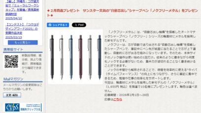 ネット応募の懸賞サンスター文具の“自動芯出し”シャープペン「ノクフリーメタル」を10名様にプレゼント 締切:2026-02-28 文房具屋さんドットコム‐プレゼントキャンペーン 賞品:サンスター文具の“自動芯出し”シャープペン「ノクフリーメタル」(10名様) 締切:2026年2月28日(土) ア...ネット応募の懸賞