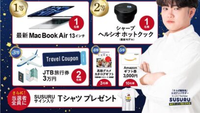 SNS応募の懸賞【X懸賞】MacBook Air、ヘルシオ ホットクック、JTB旅行券、えらべるブランド和牛、Amazonギフト券、SUSURUサイン入りTシャツを合計17名様にプレゼント 締切:2025-11-04 さらば糖脂塩‐豪華景品プレゼントキャンペーン 賞品: 最新 MacBook Air 13インチ 1名様 シャープ ヘルシオ ホットクック(最新モデル) 1名様 J...SNS応募の懸賞豪華賞品が当たる懸賞ギフト券・商品券が当たる懸賞