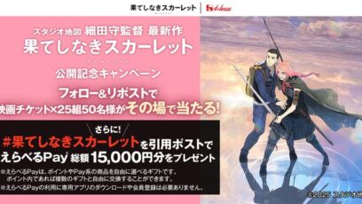 SNS応募の懸賞【毎日・X懸賞】映画『果てしなきスカーレット』ペアチケットが25組50名様にその場で当たる! 締切:2025-10-28 果てしなきスカーレット×ハウス食品グループ 映画公開記念キャンペーン 賞品: 映画『果てしなきスカーレット』ペアチケット(25組50名様) えらべるPay500円分(30名...SNS応募の懸賞毎日応募できる懸賞