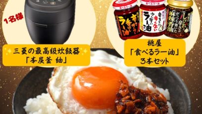 SNS応募の懸賞【X懸賞】三菱電機 本炭釜 紬、桃屋 食べるラー油3種セットを合計11名様にプレゼント 締切:2025-11-27 桃屋 × 三菱電機 コラボプレゼントキャンペーン第2弾 賞品: 三菱電機「本炭釜 紬」…1名様 桃屋「食べるラー油3種セット」…10名様 締切:2025年11月27日(...SNS応募の懸賞豪華賞品が当たる懸賞