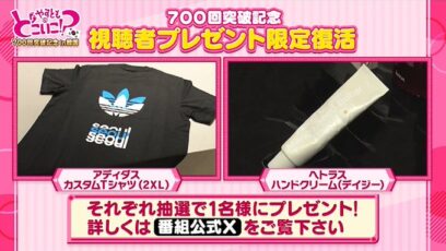 やすとものどこいこ!? テレビ大阪‐700回突破記念!韓国プレゼント 賞品:アディダス カスタムTシャツ、へトラス ハンドクリーム(2名様) 締切:2026年1月17日(土...