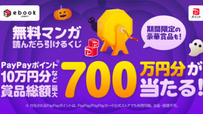 ネット応募の懸賞【毎日応募】PayPayポイント最大10万円分、ebookjapanで使える1万コイン、ebookjapanで使えるクーポンが総計228,063名様にその場で当たる! 締切:2025-11-12 無料マンガ読んだら引けるくじ 賞品: ハロウィン賞 PayPayポイント1万円分 31本 特賞 PayPayポイント10万円分 2本 1等 PayPayポイント1万円分 ...ネット応募の懸賞大量当選(1000名~)の懸賞豪華賞品が当たる懸賞ギフト券・商品券が当たる懸賞毎日応募できる懸賞