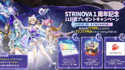 STRINOVA 1周年記念 11日間プレゼントキャンペーン 賞品: ゲーミングキーボード(1名様) オリジナルグッズ福袋(11名様) えらべるPay最大77,777円分...