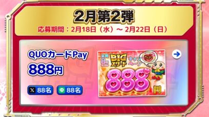 藤商事‐BIGスタートプレゼントキャンペーン 賞品:QUOカードPay888円分(176名様) 締切:2026年2月22日(日) 応募方法 LINE友だちになる ...
