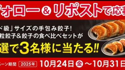SAPPORO餃子製造所‐フォロー&リポストキャンペーン 賞品:超大粒餃子&餃子食べ比べセット(3名様) 締切:2025年10月31日(金) 公式X(Twitter)...