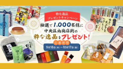 ネット応募の懸賞中央区内商店街の粋な逸品を1,000名様にプレゼント 締切:2025-10-17 中央区観光商業まつり‐粋な逸品プレゼントキャンペーン 賞品:中央区内商店街の粋な逸品(1,000名様) 締切:2025年10月17日(金) アンケートに答えてご応募く...ネット応募の懸賞大量当選(1000名~)の懸賞