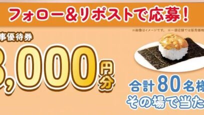 SNS応募の懸賞【毎日・X懸賞】はま寿司で使えるお食事優待券3,000円分が80名様にその場で当たる! 締切:2025-10-04 はま寿司‐うに祭り開催記念 賞品:はま寿司で使えるお食事優待券3,000円分(80名様) 締切:2025年10月4日(土) はま寿司公式X(Twitter)アカウント...SNS応募の懸賞ギフト券・商品券が当たる懸賞毎日応募できる懸賞