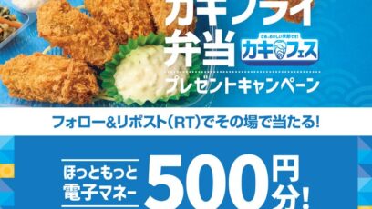 SNS応募の懸賞【毎日・X懸賞】ほっともっと電子マネー500円分が200名様にその場で当たる! 締切:2025-10-07 ほっともっと‐カキフライ弁当発売記念キャンペーン 賞品:ほっともっと 電子マネー500円分(200名様) 締切:2025年10月7日(火) ほっともっと公式X(Twi...SNS応募の懸賞大量当選(100名~)の懸賞ギフト券・商品券が当たる懸賞毎日応募できる懸賞