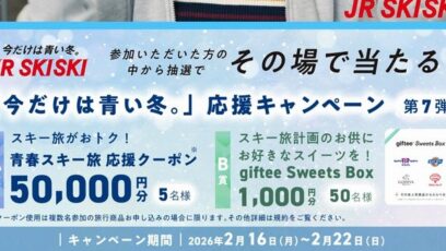 JR東日本‐スキー旅を応援する豪華景品プレゼントキャンペーン 賞品: 青春スキー旅応援クーポン50,000円分(5名様) giftee Sweets Box 1,000円分...