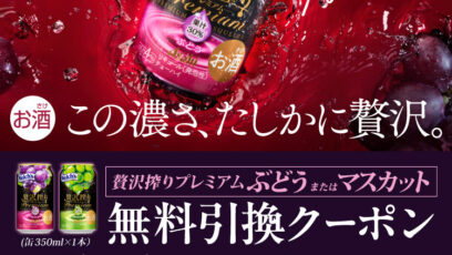 アサヒビール‐『アサヒ贅沢搾りプレミアム』が当たる!コンビニ無料引換クーポンプレゼントキャンペーン 賞品:アサヒ贅沢搾りプレミアムぶどう(350ml×1本)もしくは アサヒ贅沢...