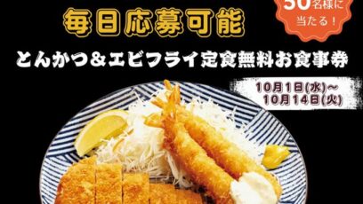SNS応募の懸賞【毎日・X懸賞】定食屋宮本むなし「とんかつ&エビフライ定食」1人前のデジタルお食事券が50名様にその場で当たる! 締切:2025-10-14 宮本むなし‐デジタルお食事券抽選キャンペーン 賞品:定食屋宮本むなしでご利用いただける「とんかつ&エビフライ定食」1人前のデジタルお食事券(50名様) 締切:2025年10...SNS応募の懸賞毎日応募できる懸賞