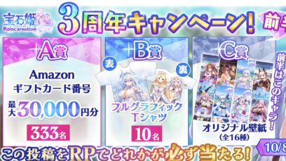SNS応募の懸賞【毎日・X懸賞】Amazonギフト券最大30,000円分、フルグラフィックTシャツが343名様にその場で当たる! 締切:2025-10-08 宝石姫 Reincarnation‐3周年記念キャンペーン 賞品: A賞:Amazonギフト券最大30,000円分(333名様) B賞:フルグラフィックTシャツ(10名様)...SNS応募の懸賞大量当選(100名~)の懸賞ギフト券・商品券が当たる懸賞毎日応募できる懸賞