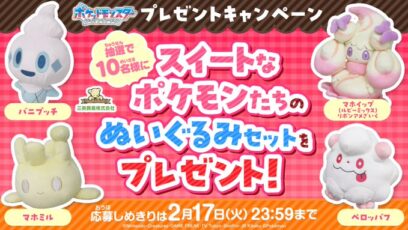SNS応募の懸賞【X懸賞】ぬいぐるみセットを10名様にプレゼント 締切:2026-02-17 アニメ「ポケットモンスター」‐フォロー&リポストキャンペーン 賞品:ぬいぐるみセット(10名様) 締切:2026年2月17日(火) 公式X(Twitter)アカウント...SNS応募の懸賞