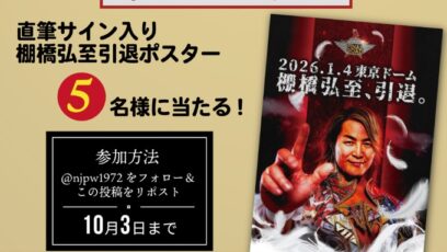 SNS応募の懸賞【X懸賞】棚橋弘至直筆サイン入り引退ポスターを5名様にプレゼント 締切:2025-10-03 新日本プロレスリング株式会社‐フォロー&リポストキャンペーン 賞品:棚橋弘至直筆サイン入り引退ポスター(5名様) 締切:2025年10月3日(金) 公式X(Twitt...SNS応募の懸賞