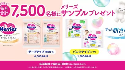 ネット応募の懸賞メリーズ おむつ 無料サンプルを7,500名様にプレゼント 締切:2025-10-31 メリーズ おむつ 無料サンプルプレゼントキャンペーン 賞品: 「メリーズ ファーストプレミアム テープ 新生児 5,000g、同Sサイズいずれか一つ(3枚組)」(6,000名...ネット応募の懸賞大量当選(1000名~)の懸賞