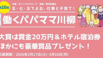 ネット応募の懸賞【川柳】賞金20万円&ホテル宿泊券、ロボット掃除機、プロジェクター、ドリップコーヒーメーカー、Amazonギフト券1万円分などを合計20名様にプレゼント 締切:2026-03-16 オリックス 働くパパママ川柳 賞品: 大賞(1句)ORIX HOTELS & RESORTSの4施設から選べる1泊2食付きホテル宿泊券、賞金20万円 パパママ目線賞(6句)...ネット応募の懸賞豪華賞品が当たる懸賞ギフト券・商品券が当たる懸賞