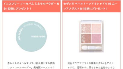 ネット応募の懸賞イニスフリー ノーセバム ミネラルパウダー N、セザンヌ ペールトーンアイシャドウ 03 ムーンアメジストを2名様にプレゼント 締切:2025-11-02 東京ビューティー‐プレゼント 賞品: イニスフリー ノーセバム ミネラルパウダー N(1名様) セザンヌ ペールトーンアイシャドウ 03 ムーンアメジスト(1名様) 締...ネット応募の懸賞