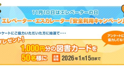 一般社団法人 日本エレベーター協会‐「エレベーターの日」キャンペーンアンケート 賞品:図書カード1,000円分(50名様) 締切:2026年1月15日(木) アンケー...