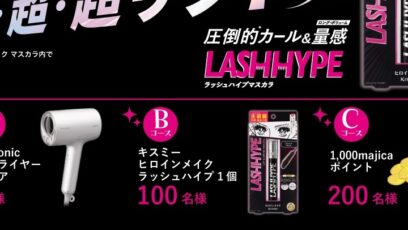 ネット応募の懸賞【アプリ】Panasonic ヘアドライヤー ナノケア、キスミー ヒロインメイク ラッシュハイプ、majicaポイントを合計305名様にプレゼント 締切:2025-10-20 majica‐まつ毛は常に上を向いていなければ!キャンペーン 賞品: Panasonic ヘアドライヤー ナノケア:5名様 キスミー ヒロインメイク ラッシュハイプ:100...ネット応募の懸賞大量当選(100名~)の懸賞
