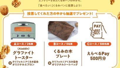 ネット応募の懸賞【毎日応募】Aladdin グラファイトトースター、くるみの木プレート、オリジナルグッズ、えらべるPay500円分を合計507名様にプレゼント 締切:2025-10-19 カリフォルニアくるみ協会‐くるみ大収穫祭・くるみパン オブ・ザ・イヤー 賞品: Aladdin グラファイトトースター+オリジナルエプロン 2名様 くるみの木プレート+オリ...ネット応募の懸賞大量当選(100名~)の懸賞ギフト券・商品券が当たる懸賞毎日応募できる懸賞