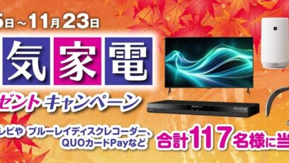 ネット応募の懸賞4K液晶テレビ、空気清浄機、ブルーレイディスクレコーダー、コードレススティック掃除機、ドライヤーなどを合計117名様にプレゼント 締切:2025-11-23 COCORO MEMBERS‐人気家電プレゼントキャンペーン 賞品: 4K液晶テレビ 4T-C50GL1(1名様) ブルーレイディスクレコーダー 2B-C10GW1(2名様...ネット応募の懸賞大量当選(100名~)の懸賞豪華賞品が当たる懸賞ギフト券・商品券が当たる懸賞