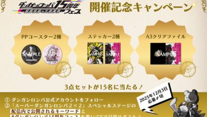 SNS応募の懸賞【X懸賞】3点セットを15名様にプレゼント 締切:2025-12-03 ダンガンロンパ‐#ダンガンロンパ15周年フェス 開催記念Xキャンペーン 賞品:3点セット(15名様) ・限定オリジナルPPコースター ・限定オリジナルステッカー2種1セット...SNS応募の懸賞