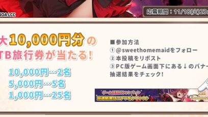 SNS応募の懸賞【X懸賞】JTB旅行券最大10,000円分を合計32名様にプレゼント 締切:2025-11-18 スイートホームメイド‐#スイメド 2周年記念 ゲーム連動プレゼントキャンペーン 賞品:JTB旅行券最大10,000円分(32名様) 締切:2025年11月18日(月) ...SNS応募の懸賞ギフト券・商品券が当たる懸賞