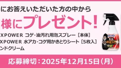 ネット応募の懸賞マジックリン EXPOWER コゲ・油汚れ用泡スプレー、水アカ・コゲ用かきとりシート、アトリックス ハンドクリーム チューブを30名様にプレゼント 締切:2025-12-15 花王 My Kao‐プレゼントキャンペーン 賞品:『マジックリン EXPOWER コゲ・油汚れ用泡スプレー 本体 400ml』、『マジックリン EXPOWER 水アカ・コゲ用か...ネット応募の懸賞