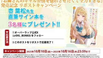 SNS応募の懸賞【X懸賞】枩 葉松先生の直筆サイン本を3名様にプレゼント 締切:2025-10-16 オーバーラップ情報局‐フォロー&リポストキャンペーン 賞品:枩 葉松先生の直筆サイン本(3名様) 締切:2025年10月16日(木) 公式X(Twitter)アカウン...SNS応募の懸賞
