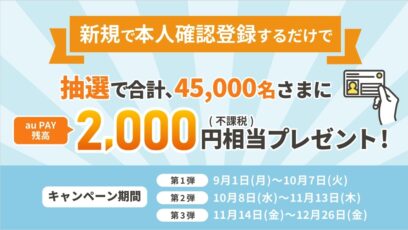 ネット応募の懸賞au PAY 残高2,000円相当を合計45,000名様にプレゼント 締切:2025-12-26 au PAY、本人確認登録で2,000円相当が当たるキャンペーン 賞品:2,000円相当のau PAY 残高(合計45,000名様) 締切:2025年12月26日(金) ...ネット応募の懸賞大量当選(1000名~)の懸賞ギフト券・商品券が当たる懸賞