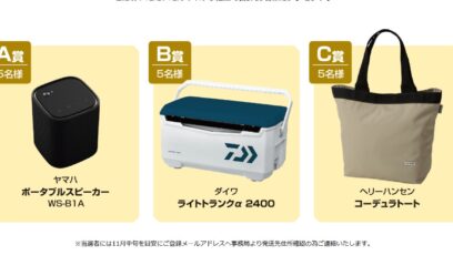 ネット応募の懸賞ヤマハ ポータブルスピーカー WS-B1A、ダイワ ライトトランク α2400、ヘリーハンセン コーデュラトートを合計15名様にプレゼント 締切:2025-10-31 ヤマハ発動機‐YAMAHA MARINE プレゼントキャンペーン 賞品: A賞:ヤマハ ポータブルスピーカー WS-B1A(5名様) B賞:ダイワ ライトトランク α240...ネット応募の懸賞