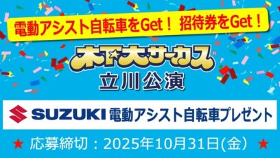 ネット応募の懸賞スズキ電動アシスト自転車、木下大サーカス立川公演ご招待券を合計51名様にプレゼント 締切:2025-10-31 木下大サーカス‐スズキバイクプレゼント 賞品: スズキ電動アシスト自転車&木下大サーカス立川公演ご招待券(1名様) 木下大サーカス立川公演ご招待券(50組100名様) ...ネット応募の懸賞豪華賞品が当たる懸賞